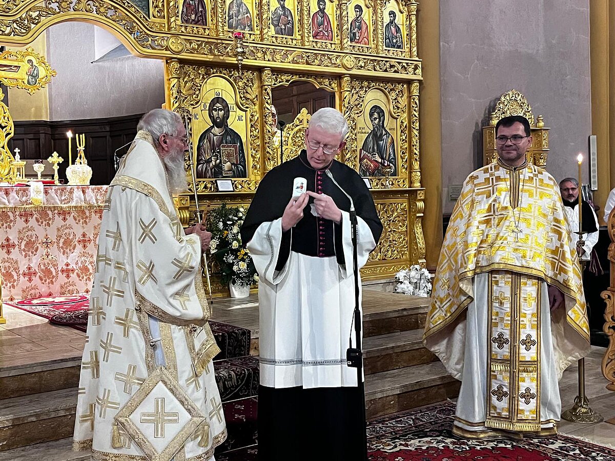 Après avoir remercié le premier curé de la paroisse, le père Constantin Duțuc, et le nouveau curé depuis 2024, le père Ion Tîrgoală, pour leur bon travail dans cette paroisse vivante et en croissance, le chanoine Patrick Muller a remis au Métropolite Serafim une bougie avec le logo de l’année Sainte « Pèlerins d’Espérance ». Tout en leur présentant les meilleurs vœux du cardinal Hollerich, il a invité les fidèles à « avancer ensemble avec Jésus-Christ présent parmi les chrétiens des différentes confessions chrétiennes, comme le pape Léon nous invite à le faire, dans la continuité de l’Année sainte initiée par le pape François. »