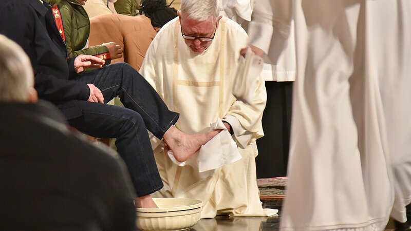 Après l’homélie, le rite du lavement des pieds rappelle le geste de Jésus vers ses disciples. Geste qui leur a donné la pureté, mais aussi le devoir de faire de même les uns pour les autres, pour appliquer son commandement nouveau : « Aimez-vous les uns les autres comme moi-même je vous ai aimés ». Monseigneur Hollerich, prêtre configuré au Christ, dépose la crosse, la mitre et la chasuble. Il lave et embrasse les pieds des catéchumènes, visiblement émus. Pendant ce temps, la maîtrise de la cathédrale chante les antiennes grégoriennes et la beauté des voix est telle que l’on en oublierait presque que l’orgue s’est tu.