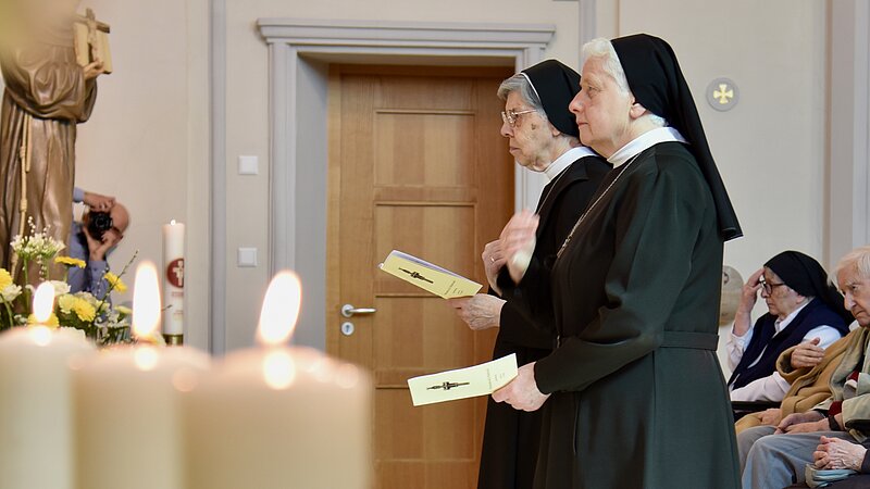 Après l’homélie, sœur Dorothe-Maria Lause, supérieure générale de la Congrégation, a dit quelques mots pour introduire le renouvellement de la profession religieuse des sœurs jubilaires. « Il y a cinquante ans, vous avez décidé de vivre selon les préceptes du saint Évangile. C’est avec une profonde gratitude pour votre fidélité que nous célébrons aujourd’hui votre jubilé. Vous réaffirmez votre engagement envers notre vie franciscaine et renforcez votre décision de suivre le Christ par le renouvellement de vos vœux. À la lumière de l’Évangile que nous venons d’entendre – « Allez dans le monde entier et prêchez l’Évangile » –, vous prononcez à nouveau votre « oui » et votre volonté de poursuivre le chemin que vous avez commencé il y a cinq décennies. Célébrons maintenant cet acte solennel de foi et de consécration dans une communion fraternelle et prenons à cœur ce que François d’Assise nous dit aujourd’hui, à nous tous, à la fin de sa vie : J’ai fait ce qui m’incombait ; quant à ce qui vous incombe, que le Christ vous l’enseigne. »