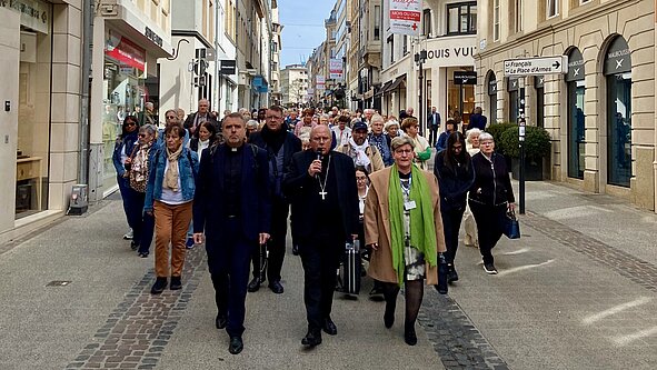 Kurz nach 9 Uhr brachen die Pilger der CVX vom Centre Jean XXIII auf und legten die 2,5 Kilometer bis zur Kathedrale singend und betend zurück. Meditationen, Zeugnisse und Zeiten des Austauschs prägten den Weg. Die Messe wurde am Mittag von Pater Josy Birsens gefeiert, einem luxemburgischen Jesuiten, der derzeit im ignatianischen Exerzitienzentrum La Pairelle tätig ist.