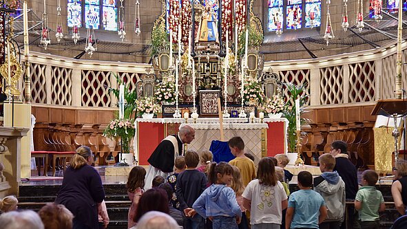 La bénédiction des enfants est un moment particulier au cours de l’Octave. Un petit temps d’enseignement, des chants et surtout beaucoup de simplicité. Le chanoine Tom Kerger, curé de la cathédrale, sait se mettre au niveau des petits qui accourent à l’autel sans timidité.
