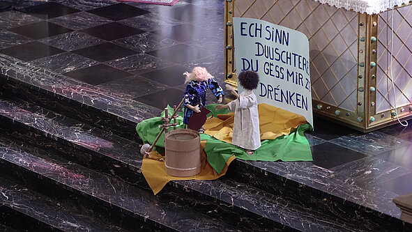 Dekan Edmond Ries zelebrierte heute Morgen die beiden Messen, die nötig waren, um die zahlreichen Schüler des Fieldgen zu empfangen. Die Schüler hatten sich dafür entschieden, das Evangelium vom Gelähmten zu inszenieren. Von der Rue Notre-Dame kam ein Mädchen, das von seinen Mitschülern auf einer Trage herangetragen wurde. Dieses „sakrale Theater“, wie Dekan Ries es nannte, hat den Schülern zweifellos geholfen, sich in den Text zu vertiefen.