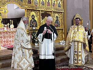 Après avoir remercié le premier curé de la paroisse, le père Constantin Duțuc, et le nouveau curé depuis 2024, le père Ion Tîrgoală, pour leur bon travail dans cette paroisse vivante et en croissance, le chanoine Patrick Muller a remis au Métropolite Serafim une bougie avec le logo de l’année Sainte « Pèlerins d’Espérance ». Tout en leur présentant les meilleurs vœux du cardinal Hollerich, il a invité les fidèles à « avancer ensemble avec Jésus-Christ présent parmi les chrétiens des différentes confessions chrétiennes, comme le pape Léon nous invite à le faire, dans la continuité de l’Année sainte initiée par le pape François. »