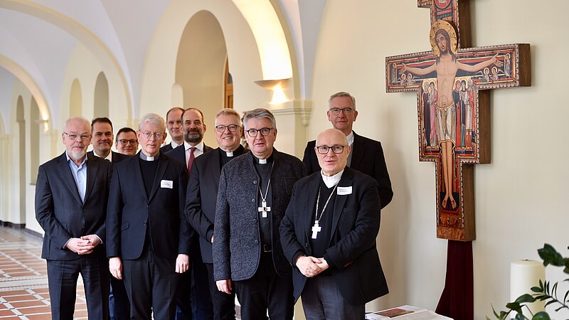 Auf dem Foto erkennt man die Teilnehmer (v.l.n.r.): Generalökonom Marc Wagener, Dr. Ralph Poirel (DBK), Tobias Knell (DBK), Generalvikar Patrick Muller, Dr. Paul Metzlaff (DBK), Dr. Mathias Belafi, Leiter des katholischen Büros Bayern, Generalvikar Dr. Michael Bredeck (Paderborn), Bischof Dr. Peter Kohlgraf (Mainz), Vorsitzender der Pastoralkommission der DBK, Weihbischof Leo Wagener, Diözesanadministrator Dr. Antonius Hammers (Münster).